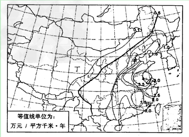 4、单选题 下图为“中国自然灾害平均损失等值线图”,读图回答下面1-2题