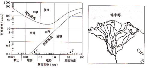 3.右图位于尼罗河入海口,由于河流流速减缓,故导致了从上游搬运而来的颗粒物在此逐渐沉积,故只有乙点能反映从河流上中游的搬运,而在此由于流速减缓,而泥沙沉积。