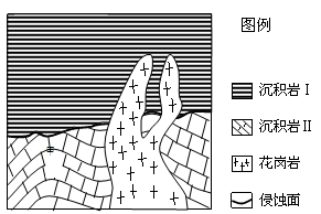 本题解析:褶皱形成后,背斜顶部缺失,应是被侵蚀掉了;沉积岩I是覆盖在褶皱之上的,褶皱后有沉积作用;花岗岩是侵入在褶皱和沉积岩中的,应在褶皱和沉积作用之后出现。选C正确。