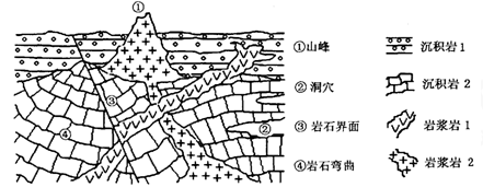 【小题1】由图可知,岩层弯曲褶皱,褶皱上部有岩浆,证明岩浆晚于褶皱,岩浆侵入到顶部的沉积岩,所以岩浆侵入晚于沉积作用,因为断层破坏了岩浆侵入通道,所以最后是断裂。