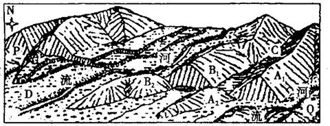 【小题2】在PQ这条考察线路上,这名同学发现了一些有趣的现象:两侧的三角形陡崖一字排开;A1与A2、B1与B2山脉并不相连,但岩石类型和组合形态相同;多条河流不约而同地拐了个弯。对此,合理的解释是