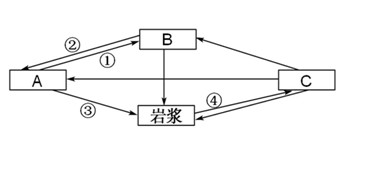 (1)图中所示字母代表的岩石类型依次为A_____________,B_____________,C_____________。