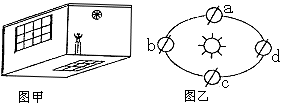 1、地球公转到图乙中a、b、c、d四位置时,正午射进屋内的阳光面积达到一年中最大值的是