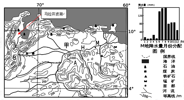 该区域的马拉开波盆地四周山地环绕,盆地中心是南美洲最为湿热的马拉开波湖,该湖除北部委内瑞拉湾沿岸气候干燥、年降水量不足500毫米外,湖区大部分高温多雨,年平均降水量1500毫米以上。湖泊东部的H河水能蕴藏量大,流域面积88万平方公里,人口约有225万,人烟稀少。图中甲国为拉丁美洲人均GDP较高的国家,与中国有良好的贸易关系,2006年8月双方签订了农田灌溉系统建设、矿产品开采、机电生产等多项协议。