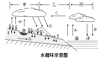(2)水循环分为?循环.? __循环和?循环,辽河主要参与的是__ ?__循环,台风属于水循环的___? ____(填字母)环节,图中与人类关系最密切的水循环环节是哪一个?(填字母)。