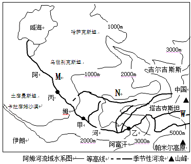 阿姆河是中亚最大的河流,发源于阿富汗与克什米尔地区交界处兴都库什山脉北坡海拔约4900m的维略夫斯基冰川,干流向西北,最后汇入咸海。阿姆河的主要补给水源来自雪水、冰川融水,雨水补给对河流径流的作用不大。该河流泥沙含量在中亚河流中均居于前列,带到咸海里去的泥沙大约为中游附近输沙量的11%。阿姆河流域修建了许多水渠,在一些支流上还修建了一系列的季节性调节水库。乙和丙是河流上、中和下游的分界点。