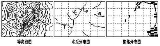 1、单选题 下图为同一地区等高线,水系分布,聚落分布图,读图,完成下列各题。