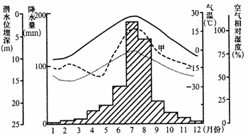 小题3:根据甲曲线潜水位埋深小于5米时,所处的月份为7-8月,查看空气相对湿度曲线,数值大于50%;查看降水量柱状图,降水量大于100mm,查看气温变化曲线,月均温大于15℃;夏季降水量多,土壤处于淋盐状态,盐分低。所以本题选择D选项。