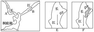 小题1:F图中沙洲露出的较多,说明河流的流量较小,此时有洞庭湖对长江水的补给作用,因此A处的流量小于B处。
