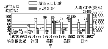 材料2:部分国家城市化及其经济发展情况统计图(图甲)和部分国家城镇人口在总人口中所占百分比统计图(图乙)。