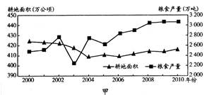 3、单选题 图甲表示2000年—2010年安徽省耕地面积和粮食产量变化,图乙表示2000年、2010年安徽省农作物播种面积结构。读图完成下列问题。