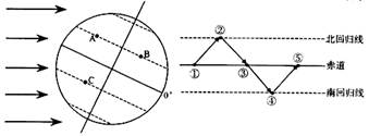 5、综合题 读太阳光照图(左图)和“太阳直射点的回归移动示意图”(右图),完成下列要求。(7分)