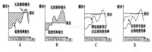 通过读图可以看出A图旅游供应很大,但利用率过低而造成很大的损失;B图反映的因无法接待而造成的经济损失;C图增加旅游项目后吸引更多游客使使用率提高而降低了损失,D图在淡季游降低价格以吸引更多游客,而在旺季提高价格而减少游客最终减少无法接待的损失。