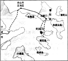 材料二?图为舟山市普陀区蚂蚁岛位置示意图,图中虚线和实线为交通线。该岛计划开发以海岸观景、渔家体验为主要内容的“渔家风情”旅游资源。