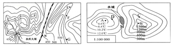 【小题1】图示比例尺为1:100000,故图上0.5厘米,表示实际距离500米。图示水库大坝跨两条等高线,故最高坝高为100米。