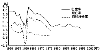 1、单选题 读“我国人口出生率、死亡率和自然增长率变化图”,回答1—3题。