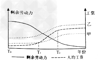 5、单选题 下图表示某区域在一定时期内剩余劳动力数量,人均工资的变化,以及甲、乙两类企业在该区域维持最低经济效益所能支付人均工资的变化,读图,完成1-2 题