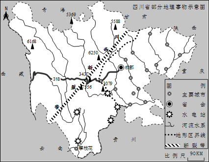 (1)根据图中各个城市的位置、相对位置和空间分布,城市主要分布在断裂带的东部,河流的中下游地区,因而可推出图中四川省城市分布的基本特征是东多西少,沿河分布。