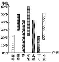 小题1:由图可知,咖啡适宜在0°--20°N之间生长;葡萄适宜在30°N--50°N之间生长;茶适宜在0°--40°N之间生长;苹果适宜在20°N--60°N之间生长;水稻适宜在0°--40°N之间生长;可可适宜在0°--20°N之间生长;小麦适宜在20°N--50°N之间生长;热量适应范围较大的是水稻、茶、苹果。