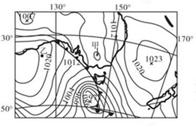 【小题1】图中相邻等压线的压差为4百帕。因相邻的等值线其数值相等或差一个定值,可判断图中甲地等压线数值可能为1004或1008百帕。等值线两侧数值取值范围不同。图中乙地气压在1020—1024百帕之间。若甲处等压线数值为1004,则甲地气压介于1000—1004百帕之间,甲、乙气压相差16—24百帕之间;若数值为1008,则甲地气压介于1008—1012百帕之间,甲、乙两地气压相差8—16百帕之间。故B不可能。