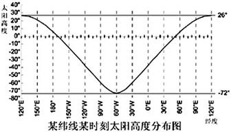 2、单选题 在昼半球上各地太阳高度角为正值,在夜半球上各地太阳高度角为负值,如左图:H1为正午为太阳高度,H2为午夜太阳高度。右图为某纬线某时刻太阳高度分布图,此纬线上各点正午直立地表物体日影朝北。回答1-3题。