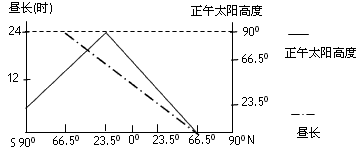 1、单选题 下图是沿120°E经线全球的昼长和正午太阳高度分布图,回答1—2题。
