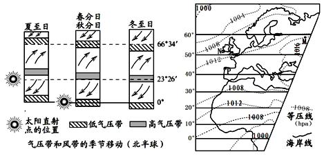 因太阳直射点的南北移动,导致在地球上出现了气压带和风带交替控制形成的独特的气候区域,如在下右图中大约10°N~20°N大陆西部地区以及30°N~40°N大陆西部地区均属这一情况。在30°N~40°N大陆西部地区,夏季受副热带高气压带控制,降水稀少,冬季受西风带控制降水较多。就即使在常年受同一大气环流控制地区内的不同地点,大气环流也存在差异。下图示意分别示意气压带和风带的季节移动(左)和欧洲、非洲局部某时刻气压场分布(右)。据此回答下列问题。