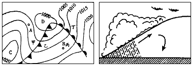 2、综合题 下图为北半球某地天气系统图,分析回答下列问题。