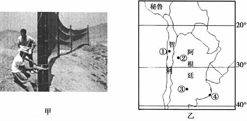 1、单选题 下图中甲为一张长12米、宽4米的大网,网的下方有水槽可以把网上流下的水引向一个蓄水池。乙为南美洲部分国家图,读图回答下列各题。