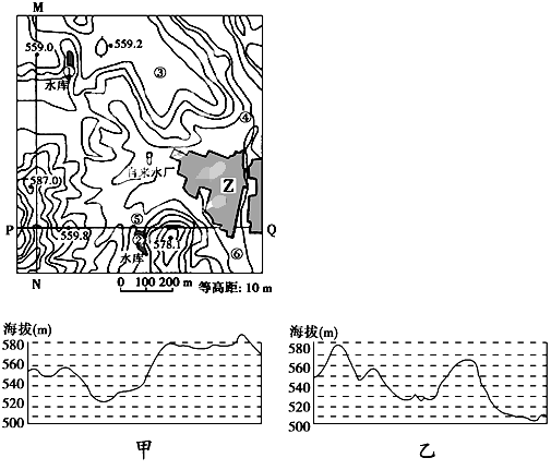 3、综合题  下图是某地地形图,MN、PQ是地形剖面线。①、②是水库,为了Z村的发展,该地新建了一座自来水厂。读图完成下列各题。(10分)