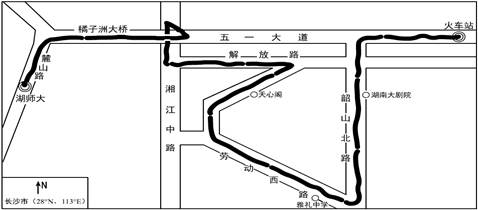 该图为长沙市202路公交车自火车站至湖师大路线示意图,请根据小周的描述,回答问题。