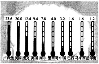 下图为部分国家人均温室气体排放量(单位:吨)比较图。
