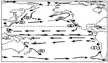 小题2:太平洋有两大渔场,一是位于西北太平洋沿岸,由日本暖流和千岛寒流交汇形成的北海道渔场;另一是位于东南太平洋沿岸,由沿岸上升流形成的秘鲁渔场。符合的是①⑤。