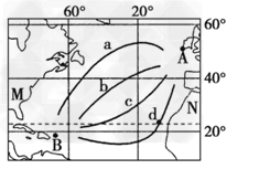 (1)本题考查洋流的分布规律。洋流分布规律:①中低纬度海区形成以副热带高压为中心的大洋环流,北顺南逆;②北半球中高纬度海区形成以副极地低压为中心的逆时针大洋环流;③南纬40°附近海域形成环球性西风漂流。④北印度洋海区形成季风环流,夏顺冬逆。图中为北半球的中低纬度大洋环流,所以a洋流向北,b洋流向南,c洋流向东,d洋流向西。