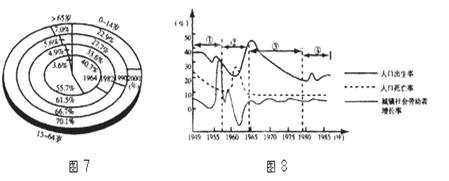 5、单选题 2010年11月1日O时开始,我国开始进行第六次人口普查。图7为近四次人口普查“中国各年龄段人口占总人口比重变化图”,图8为我国人口增长曲线图。读图回答问题。