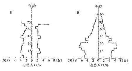 4、综合题 下图表示两类不同经济发展水平国家的人口年龄构成示意图,根据图示回答下列问题(7分)
