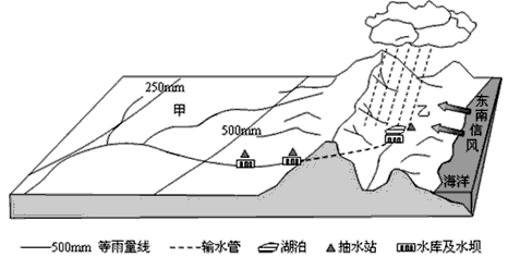 1、单选题 下图所示甲地区为某国主要农业区,政府大力修建水利工程,将乙地区的水资源调到甲地区。读图完成1—2题。