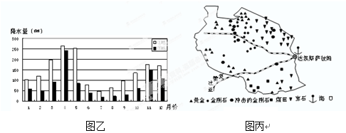 5、综合题 (18分)根据图文(图甲为非洲局部区域图,图乙为图甲中①、②两地的降水量统计图,图丙为坦桑尼亚主要矿产资源分布图),完成下列问题。