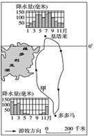 小题2:该地降水受赤道低气压带移动影响,图中多多马位于游牧的最南端,1-3月降水较多,随赤道低气压带的移动,至甲地,4月份降水应较多,而1月、7月和10月等降水较少。故选B。