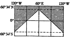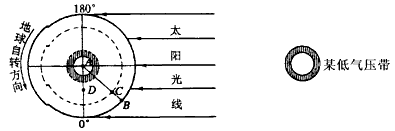 1、综合题 下图为地球某日太阳照示意图,图中阴影部会为黑夜,其他地区为白昼,读图完成下列各题。