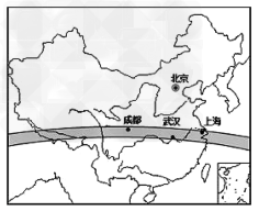 2、单选题 2009年7月22日上午9时左右(北京时间),千年一遇的日全食自西向东扫过我国长江流域(如图阴影所示),读图完成1—2题。