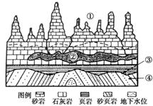 小题1:联系图例是准确获取图中有效信息的一个关键。根据图示特征可以看出该地为喀斯特地貌①处为石林、峰丛是流水溶蚀作用的结果;②处为溶洞由流水溶蚀而成;③所指示界面是由于地质时期背斜顶部出露于地表发生风化、侵蚀作用然后地壳下沉发生沉积形成;④指示的岩层弯曲是由内力挤压作用形成。