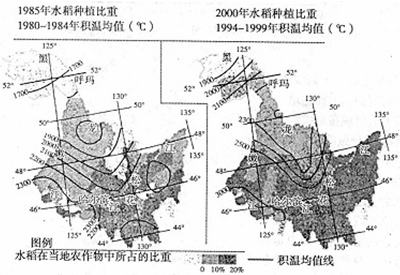 2、单选题  图为某省水稻种植比重以及两个时段积温均值变化图,结合所学回答下列各题。