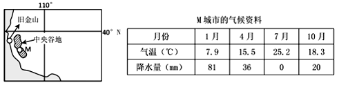 小题1:由气候资料可知,M为地中海气候,冬季多雨;中央谷地位于海岸山脉和内华达山之间,冬季盛行西风,但经海岸山脉后形成下沉气流,降水减少;而旧金山在沿海,无山地阻挡,冬季西风影响强,降水多。选B正确。