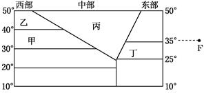 小题2:根据图示F大约位于35°N的大陆东侧,应大致为温带季风气候和亚热带季风气候的过渡地带,而该地为小岛,受海洋影响较大,故判断冬季均温大于0°C,由于大陆东岸受季风环流影响,冬季盛行西北季风,故小岛的西侧为西北季风的迎风坡,故降水量较大。