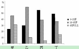3、单选题 图5表示甲、乙、丙、丁四个国家2008年0~15岁、15~65岁、65岁以上三个年龄段人口占总人口的比重,读图回答。