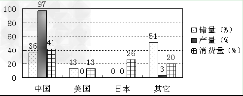 3、单选题 下图是目前部分国家和地区稀土储量、产量和消费量占世界百分比统计图。回答1~2题。