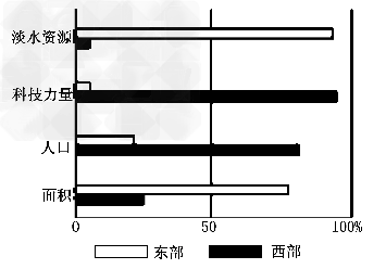 3、单选题 下图表示某国两大经济地带的基本资源指标(﹪)。读图回答,该国最有可能的是