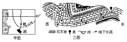 2、单选题 下图中,甲为某区域示意图,乙反映甲中的P地河谷及其附近地质剖面,P地河谷剖面形态的形成与地转偏向力的作用有关。读图回答1—2题。