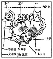 3、单选题 冰岛多次被联合国评为“最宜居国家”。2010年5月,上海世博会冰岛馆展示的主题是“纯能源——健康生活”。读冰岛地形图,回答1—4题。